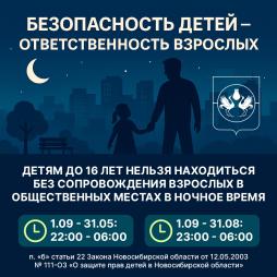 Детям до 16 лет нельзя находиться без сопровождения взрослых в общественных местах в ночное время: Что важно сделать родителям: Обсудить с ребёнком маршруты и время возвращения домой. Обеспечить сопровождение взрослого.